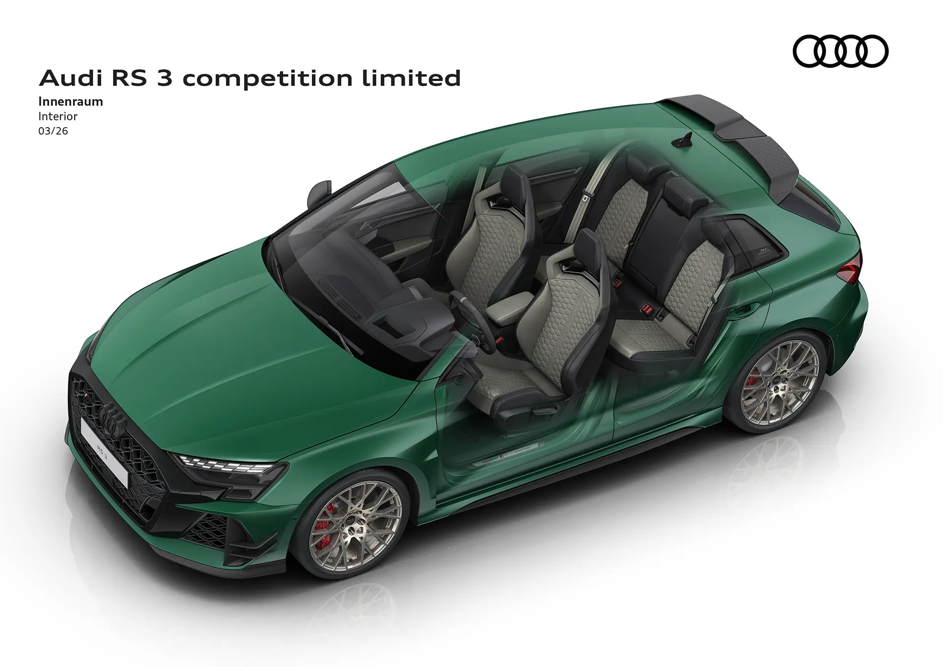 אודי RS3 קומפטישן תשווק במספר מוגבל של 750 עותקים בלבד כאשר היא תהיה זמינה במרכב ספורטבק או סדאן בהתאם לשוק היעד. עם 400 כ"ס ו-51 קג"מ, מנוע ה-2.5 ליטר 5 צילינדרים טורבו שב- RS3 קומפטישן נותר ללא שינוי לעומת הגרסאות הרגילות של הדגם, לא שיש מה להתלונן על נתון 0-100 קמ"ש של 3.8 שניות ומהירות מרבית של 290 קמ"ש, אך היינו מצפים לעוד קצת מיץ עבור הדגם שהוא כנראה מהדורת הסיום של המנוע הנפלא הזה.